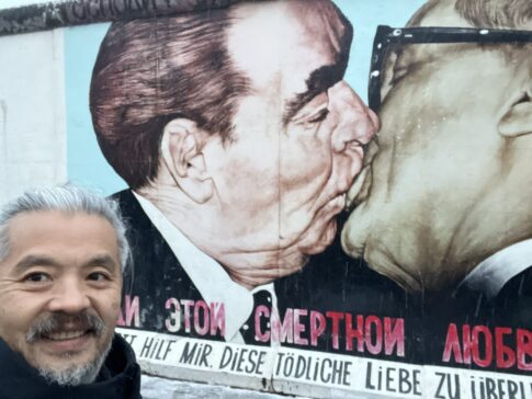 カフカの像やユダヤ人街、そしてペストの歴史を話しながら彼と一緒に街を歩いて回ります。下の写真はユダヤ人街にあるシナゴーグとカフカの像といっていました。この像について調べてみると、カフカ没後80年を記念してヤロスラフ・ロナによって設計され、カフカがAccuintanceの肩に飛び乗ってカレル橋を渡る際の短編小説「闘争の記述」から着想を得ているそうです。