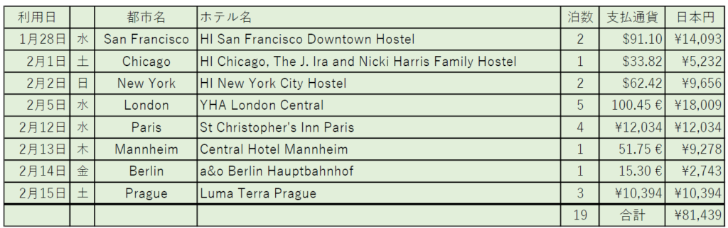 そして、宿泊費は下の表のとおりです。