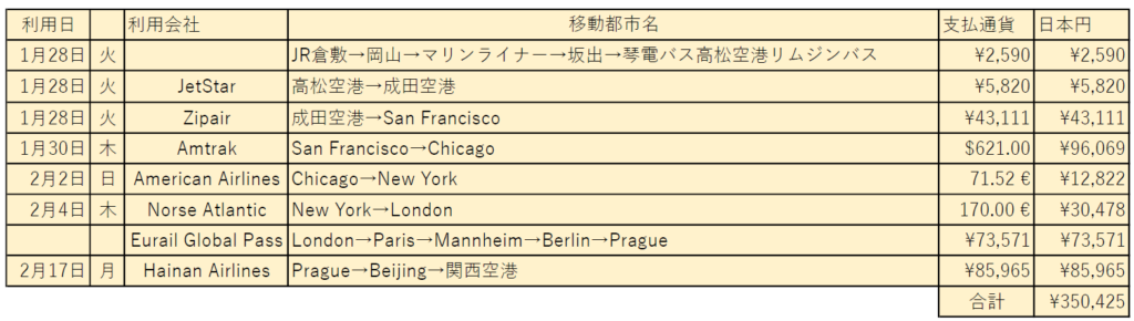 成田空港→サンフランシスコ→ (Amtrak) →シカゴ→ニューヨーク→ロンドン→(Eurostar)→パリ→(TGV)→マンハイム(ドイツ)→ハイデルベルク→ベルリン→プラハ→北京→関西空港→(神戸-関空ベイ・シャトル)→神戸空港