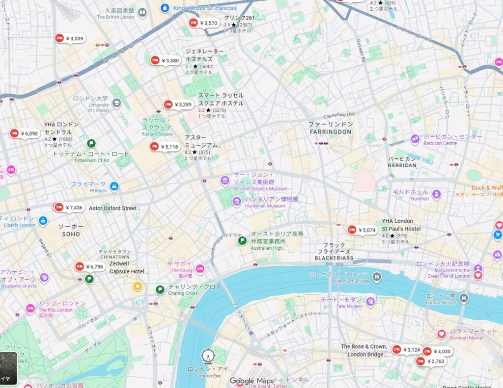 宿泊もGoogle mapを利用すれば、値段なども含めて、安いホテルを探せます。正直なところ、女性の一人旅であれば、危険もあるのでホテルのレベルを三つ星以上に上げて欲しいと思います。宿泊先の予約は基本的にAgodaを利用しました。下の画像では、ロンドンの中心街で、12月1日から一人で一泊できる1万円以下の宿を表示しています。私は左端にあるYHAロンドンセントラルに泊まりました。大英博物館にもキングスクロス駅にも徒歩圏内の清潔な宿でした。