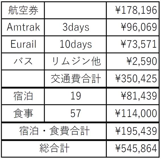 Eurail passは日数を減らすことが可能だったので、¥50,000円程度にできました。